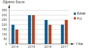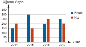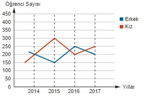 Yukarıdaki çizgi grafiğinde bir kursa kayıt yaptıran öğrencilerin cinsiyetlerine göre sayılarının yıllara göre değişimi verilmiştir.