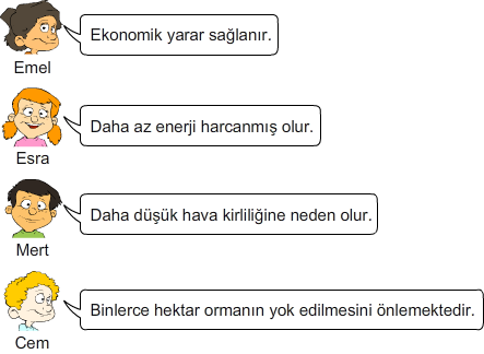 Geri dönüşüm ile yeni kağıt yapmanın faydalarını yukarıdaki öğrencilerden hangileri doğru olarak ifade etmiştir?