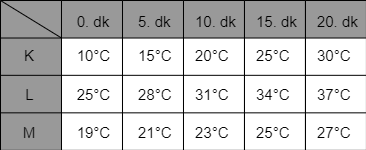 İçlerinde eşit miktarda sular bulunan K, L ve M kapları özdeş olmayan ısıtıcılarla eşit süre ısıtıldıklarında, sıcaklık değişimleri aşağıdaki tabloda verildiği gibi olmaktadır.