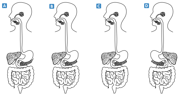 Sindirim sistemine ait aşağıdaki şemalardan hangisi organların yeri ve birbirlerine bağlantıları bakımından doğru çizilmiştir ?