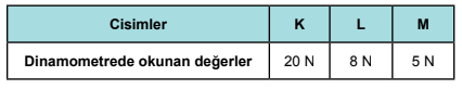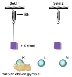 Yükünü bilmediği K, L ve M iletken kürelerini yalıtkan eldiven giymiş olduğu eliyle sabit ve X cismine etki edecek şekilde tutuyor. X cisminin bağlı olduğu dinamometrede okunan değerleri aşağıdaki tabloya kaydediyor.