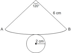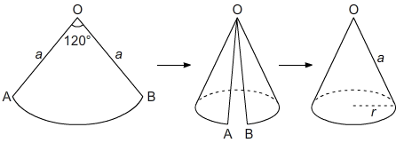 Şekildeki merkez açısının ölçüsü 120º olan daire diliminin A ve B köşeleri üst üste gelecek şekilde kıvrılarak yarıçapı r cm olan bir dik dairesel koni oluşturuluyor.