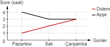 Yukarıdaki grafikte Ayşe ve Didem ’in haftanın ilk üç gününde yapmış oldukları egzersiz sürelerinin değişimi verilmiştir.
