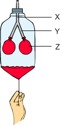 Murat pet şişe, balon ve Y şeklinde boru kullanarak soluk alıp verme mekanizmasını göstermek için aşağıdaki modeli tasarlamıştır.