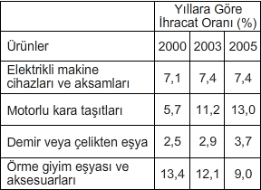 Yukarıdaki tabloda Türkiye ’nin en fazla ihraç ettiği bazı ürünlerin çeşitli yıllardaki oranları verilmiştir.