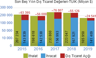 Yukarıdaki grafikteTürkiye´nin son beş yılda dış ticaret değerleri verilmiştir.