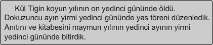 "Ondan sonra oğul, babaya benzemediği için bilgisiz kağanlar devletin başına geçmiş. Kağanların yardımcıları da bilgisiz kişilermiş. Türk halkı da Çin´in tatlı sözüne, ipeğine kandığı için Çin hakimiyetine girmiş. Gök Tanrı Türk milleti yok olmasın diye babam İlteriş Kağan ile annem il Bilge Hatun´u tahta çıkarmış."