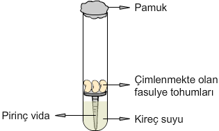 Ahmet, çimlenmekte olan fasulye tohumlarını kullanarak yukarıda gösterilen deney düzeneğini hazırlıyor. Bir müddet sonra kireç suyunun rengi bulanmaya başlıyor.
