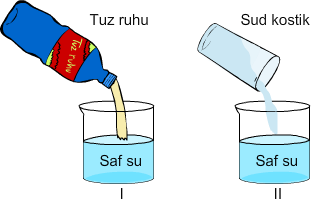 Aşağıda içlerinde aynı miktar su bulunan kaplardan I. kaba tuz ruhu, II. kaba ise sud kostik ekleniyor.