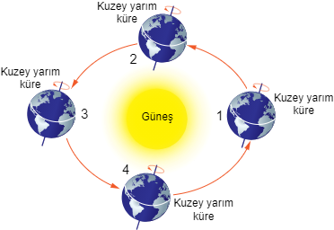 Aşağıda, Dünya´nın Güneş çevresinde dolanırken bulunduğu konumlara göre Güneş ışınlarının geldiği 4 farklı yön numaralandırılarak verilmiştir.