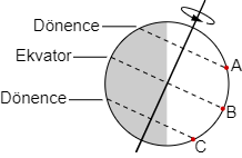 Aşağıda, Dünya ’nın Kuzey kutbu yukarıda şekilde Dünya ’nın Güneş çevresinde dolanırken bulunduğu bir konum ve Dünya üzerindeki 3 farklı nokta verilmiştir.