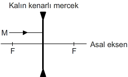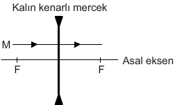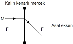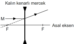 Yukarıda hava ortamında bulunan camdan yapılmış bir kalın kenarlı merceğin asal eksenine paralel olarak M ışını gönderilmiştir.
