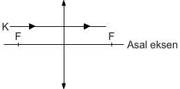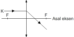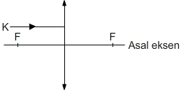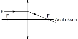 Hava ortamında bulunan ince kenarlı cam merceğin asal eksenine paralel olarak şekildeki gibi K ışını gönderilmiştir.