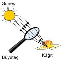 Büyüteçle, güneşli bir günde yukarıdaki gibi bir çalışma yapıldığında kağıt parçaları yakılabilir.