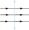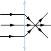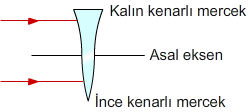Şekildeki ince ve kalın kenarlı merceğin birleştirilmesiyle oluşan sisteme gönderilen ve asal eksene paralel olan iki ışın, mercekleri aşağıdakilerden hangisindeki gibi terk edebilir?