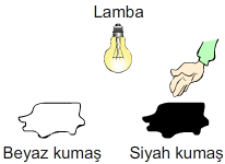 Mert, ışığın maddeler ile etkileşimini araştırmak için şekildeki düzeneği kurup, ışık altında siyah ve beyaz kumaşları lambaya eşit uzaklıkta yerleştiriyor.