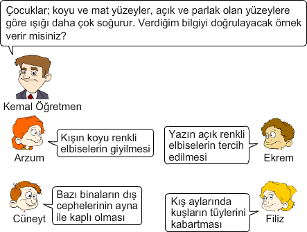 Fen ve Teknoloji dersinde öğretmen ve öğrencilerin ışığın soğurulması ve yansıması ile ilgili konuşmaları aşağıdaki gibidir.