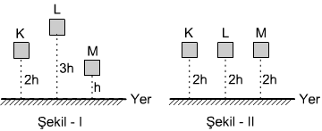 Şekil - I´deki konumda potansiyel enerjileri eşit olan K, L ve M cisimleri Şekil-ll´deki konuma getiriliyor.