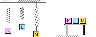 Eşit boyutlu küp şelindeki K, L ve M cisimleri özdeş yayların uçlarına asılıp serbest bırakıldığında yaylar şekildeki konumlarda dengeye gelmektedir. Bu cisimler masanın üzerine konulduğunda yere göre potansiyel enerjileri EK , EL ve EM ´dir.
