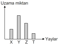 Özdeş X, Y, Z ve T yaylarının uçlarına farklı cisimler asıldığında yayların uzama miktarları şekilde verilen grafikteki gibi oluyor.