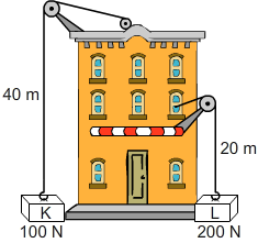 100 N ağırlığındaki K cismi ile 200 N ağırlığındaki L cismi, bir binada sırasıyla 40 metre ve 20 metre yükseklikteki noktalara çekilmektedir.