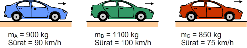 Sürtünmelerin önemsiz olduğu yatay yollarda, belirtilen yönlerde hareket etmekte olan A, B ve C araçlarının kütle ve süratleri şekilde verilmiştir.