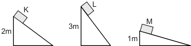 Özdeş K, L ve M cisimleri şekildeki sürtünmesiz eğik düzlemlerin tepe noktalarından serbest bırakılıyor.