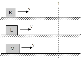 Kütleleri sırasıyla m, 2m ve 3m olan K, L ve M cisimlerini aynı süratle harekete geçiren Semih, cisimlerin üçünün de 1 hizasına ulaştığında durduğunu görüyor.