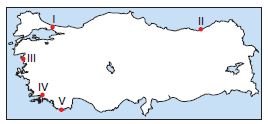Yukarıdaki Türkiye haritası üzerinde verilen noktalardan hangisinde boyuna kıyı tipi görülür?