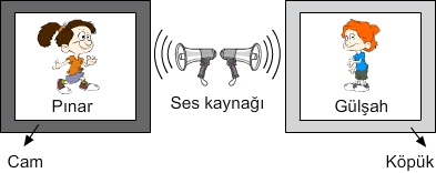 Şekilde eşit kalınlıktaki cam ve köpük düzeneklerde deney yapan Pınar ve Gülşah´ın konumları ve ses kaynağına olan uzaklıkları eşit olarak belirtilmiştir. Hazırlanan düzeneklerde, Pınar sesi daha çok duyarken Gülşah çok az duyabilmektedir.