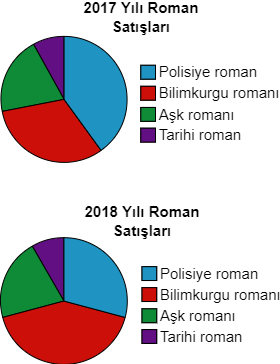 Bu grafiklerde ülkemizdeki roman türlerinin 2017 ve 2018 yıllarındaki satışlarının oranları verilmiştir. Bu grafiklerle ilgili olarak verilenlerden hangisi söylenemez?