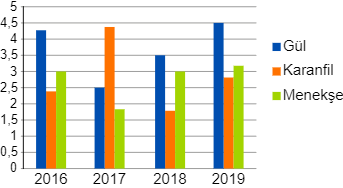 Bu grafik bir şehrimizde dört yıl içerisinde üretilen gül, karanfil ve menekşe çiçeklerinin oranlarını göstermektedir. Bu grafikten hareketle verilenlerden hangisi söylenemez?