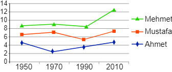 Bu grafikte Türkiye ’de erkek çocuklara en çok konulan üç ismin yıllar içindeki konulma oranları verilmiştir. Bu grafikten hareketle verilenlerden hangisi söylenemez?