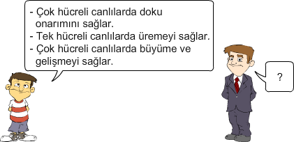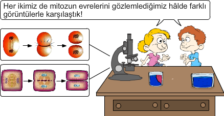 Merve ve Burak farklı hücrelerde mitozun evrelerini gözlemlemiştir. Mikroskopta gördüklerinin değişiklik gösterdiğini fark eden arkadaşlarımız bunun nedenini öğretmene sormaya karar verir.