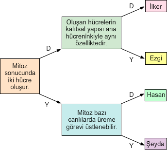 Fen bilimleri dersinde öğretmen mitoz ile ilgili alıştırmayı öğrencilerine veriyor. Öğrencilerinden ifadelerin doğru (D) veya yanlış (Y) olmasına göre uygun ok yönünde ilerleyerek çıkışa ulaşmalarını istiyor.
