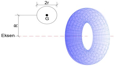 Şekilde görülen 2r çaplı çemberin ekseni etrafında döndürülmesi ile torus oluşturulmuştur. Oluşan torusun hacmi aşağıdaki seçeneklerde verilen hangi bağıntı ile hesaplanır?