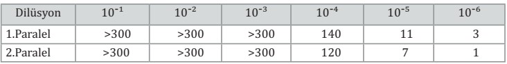 Katı numunede bakteri sayımı yapmak için, her dilüsyondan iki paralelli olacak şekilde yayma plak yöntemi ile ekim yapılmıştır. İnkübasyon sonunda petri kutularında sayılan koloni sayıları tabloda verilmiştir. Çalışmalarında alt ve üst sınır olarak 30-300 sınırlarını benimseyen bir laboratuvar için numunede bulunan bakteri sayısı (KOB/g) aşağıdakilerden hangisidir?