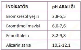 Aşağıdaki tabloda bazı indikatörlerin renk değiştirdikleri pH aralıkları verilmiştir.