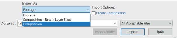 Dosya import edilirken Composition seçeneği seçilirse aşağıdakilerden hangisi gerçekleşir?