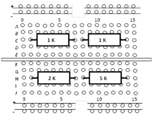 Breadboard üzerine yerleştirilmiş dirençlerin bağlantıları aşağıdaki seçeneklerden hangisindeki gibi yapılırsa RT= 2K olur?