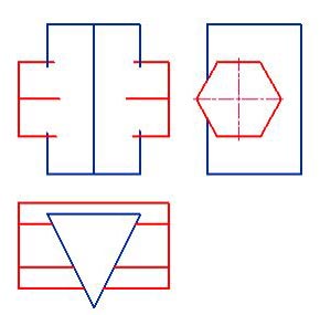 Aşağıda birbiri ile kesişen üçgen ve altıgen prizmanın ara kesitini bulunuz. Görünürlük tespiti yaparak görünüşleri tamamlayınız. Çözümü bir A4 kâğıdını masanıza bağlayarak yapınız. Ölçüleri şekil üzerinden alıp iki kat büyüterek çiziniz.
