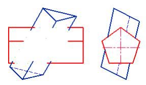 Aşağıda eksenleri birbiri ile eğik kesişen üçgen ve beşgen prizmaların ara kesitini düzlem geçirme metodunu uygulayarak bulunuz. Görünürlüğü saptayarak görünüşleri tamamlayınız. Çözümü bir A4 kâğıdını masanıza bağlayarak yapınız. Ölçüleri şekil üzerinden alıp, iki kat büyüterek çiziniz.