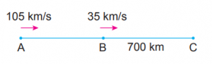 A ve B noktalarından sırasıyla 105 km/s ve 35 km/s hızlarla aynı anda aynı yöne doğru hareket eden iki araç C noktasında yan yana geliyorlar.