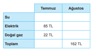 Aşağıdaki tabloda bir ailenin temmuz ayındaki su, elektrik ve doğal gaz fatura tutarlarından bazıları ve ağustos ayında bu üç faturaya ödenen toplam tutar verilmiştir.