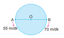 Şekildeki O merkezli dairesel pistin etrafında A ve B noktalarından sırası ile 55 m/dk ve 70 m/dk hızlarla aynı anda birbiri ile zıt yönde harekete başlayan iki hareketli 12 dakika sonra ikinci kez karşılaşmışlardır.