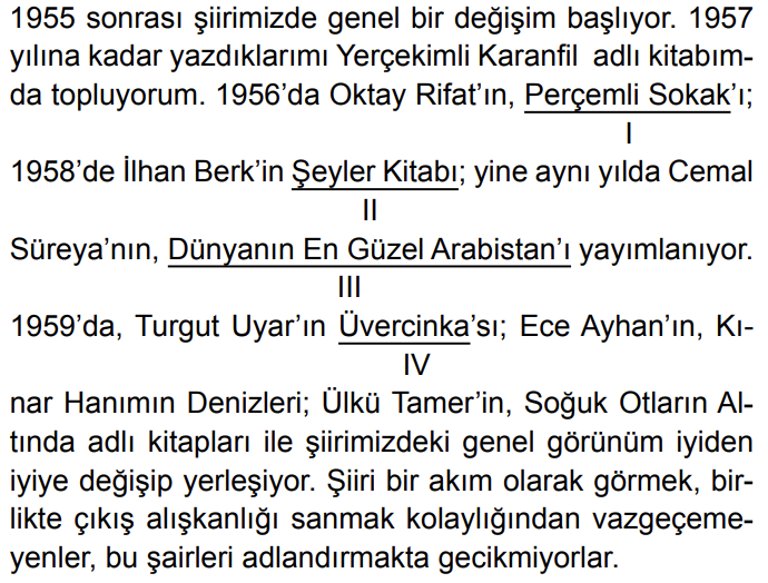I. Kınar Hanımın Denizleri-Ece AyhanII. İçime Çektiğim Hava Değil Gökyüzüdür-Ülkü TamerIII. Beni Öp Sonra Doğur Beni-Cemal SüreyaIV. Güneşi Yakanların Selamı-İlhan BerkV. Gün Doğmadan-Edip Cansever