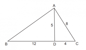 Şekildeki ABC üçgeninde |AC| = 8 cm, |CD| = 4 cm, |AD| = 5 cm ve |BD| = 12 cm olduğuna göre |AB| kaç santimetredir?