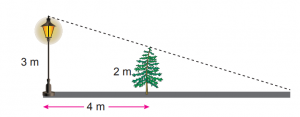 Şekildeki zemine dik 3 metre boyundaki aydınlatma direği ile 2 metre boyundaki ağaç arasındaki uzaklık 4 metredir.