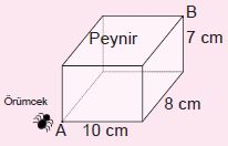 Şekilde boyutları 7 cm, 8 cm, 10 cm olan dikdörtgen prizması şeklindeki peynir verilmiştir. Peynir üzerindeki bir örümceğin A noktasından B noktasına gidebileceği en kısa yolun uzunluğu kaç cm dir?