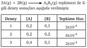A, B ve C nin derişimleri 2'şer katına çıktığında tepkime hızı 8 katına çıkıyor. A'nınderişimi sabit tutularak B ve C'nin derişimleri 2'şer katına çıkarıldığında hız 8 karına çıkıyor. C'nin derişimi sabit tutulup A ve B'nin derişimi 2'şer katına çıkarıldığında hız 4 katına çıkıyor.
